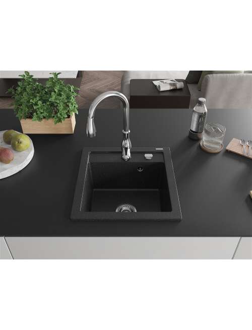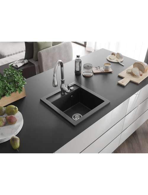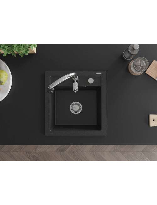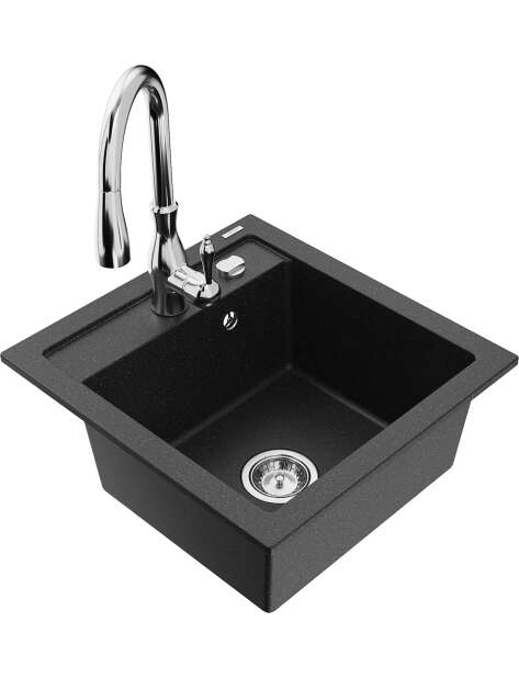 Mexen Vito zlewozmywak granitowy 1-komorowy z baterią kuchenną Savita, czarny/srebrny metalik - 6503-73-672601-00