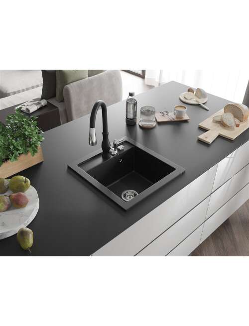 Zlewozmywak: Rozmiar: 520x490x210 mm Głębokość komory: 200 mm Wymiary komory: 410x360 mm Średnica odpływu: ø90 mm Typ: 1-komorowy Rodzaj: Wpuszczany w blat Kolor: Czarny/Srebrny metalik Wykończenie syfonu: Chrom Materiał: Granit (80% kruszywo granitowe 20% żywice) Otwór przelewowy: Tak Otwory: ( bateria, automat ) 2 Wysoka odporność na zarysowania i przebarwienia Odporność na szok termiczny Powierzchnia ułatwiająca czyszczenie Jeden dodatkowy podfrezowany otwór do samodzielnego wybicia ø35 Bateria kuchenna: Materiał: Mosiądz Kolor: Czarny Głowica: Ceramiczna Perlator: Tak Typ: Jednouchwytowa Wysokość baterii: 410 mm Zasięg wylewki: 231 mm |
