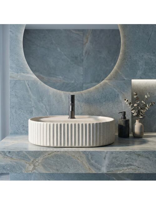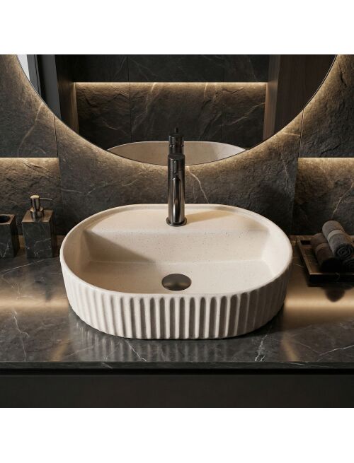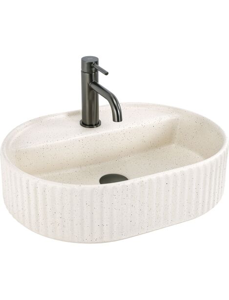 | Umywalka nablatowa Rea Marcela 50 w wariancie Vanilla to idealny wybór do łazienek, w których liczy się dopracowany detal i spokojna, elegancka kolorystyka. Ciepły odcień złamanej bieli wnosi do wnętrza lekkość i „miękkie” wrażenie czystości, a jednocześnie świetnie komponuje się z kamiennymi blatami, drewnem oraz czarną lub grafitową armaturą. Dzięki temu umywalka pasuje zarówno do nowoczesnych aranżacji premium, jak i do stylu soft loft czy modern classic.Bryła przyciąga uwagę charakterystycznym, pionowym ryflowaniem na zewnętrznej ściance, które podkreśla designerski charakter modelu i sprawia, że umywalka wygląda jak element dekoracyjny. Dodatkowym atutem jest subtelna tekstura w drobne kropki widoczna na powierzchni – nadaje ona wykończeniu głębi, naturalnego „kamiennego” efektu i sprawia, że całość prezentuje się wyjątkowo szlachetnie. Owalna, komfortowo wyprofilowana misa zapewnia wygodę podczas codziennego użytkowania, a matowe wykończenie w kolorze Vanilla pomaga utrzymać spójny, nowoczesny wygląd strefy umywalkowej. |