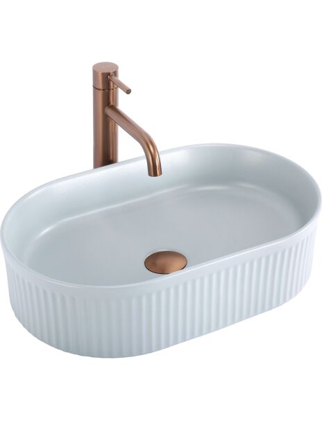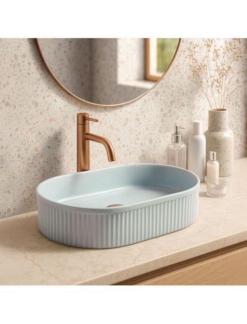 Umywalka nablatowa w kolorze Baby Blue Matt to nowoczesny element wyposażenia, który doda łazience świeżości i wyjątkowego stylu. Matowa powierzchnia w delikatnym, pastelowym odcieniu błękitu sprawia, że model prezentuje się subtelnie, a jednocześnie przyciąga uwagę swoim nietuzinkowym wyglądem. Wykonana z wysokiej jakości ceramiki sanitarnej, umywalka łazienkowa gwarantuje trwałość oraz łatwość w utrzymaniu czystości. Jej ryflowana powierzchnia zewnętrzna stanowi efektowną ozdobę, łącząc funkcjonalność z oryginalnym designem i idealnie wpisując się w aranżacje nowoczesnych wnętrz.