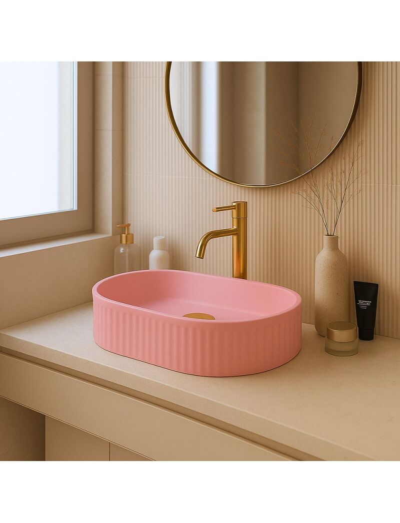 | Umywalka nablatowa w kolorze różowym Bubble Gum Matt to stylowe rozwiązanie, które nada łazience nowoczesny charakter i podkreśli jej wyjątkowy wystrój. Matowa powierzchnia w pastelowym odcieniu różu sprawia, że model wyróżnia się subtelną elegancją i doskonale wpisuje się w aktualne trendy aranżacyjne. Wykonana z wysokiej jakości ceramiki sanitarnej, umywalka łazienkowa jest odporna na codzienne użytkowanie i łatwa w utrzymaniu czystości. Jej ryflowana powierzchnia zewnętrzna tworzy efektowną dekorację, która łączy funkcjonalność z niepowtarzalnym designem, czyniąc z niej idealny wybór do nowoczesnych łazienek. |