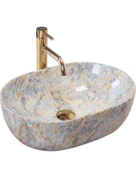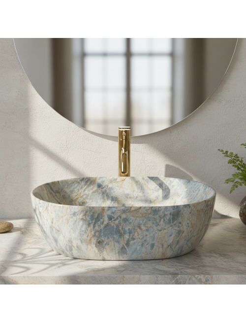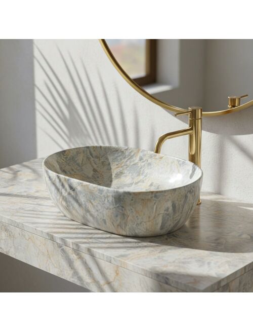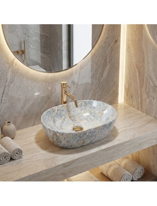 | Wybierz umywalkę nablatową Rea Amelia 48 Ruststone, jeśli szukasz ceramiki o nietypowym wykończeniu. Model ten łączy tradycyjną, owalną formę z powierzchnią imitującą naturalny kamień. Wykonana z trwałej ceramiki sanitarnej, stanowi funkcjonalny i estetyczny element wyposażenia łazienki.Wzór Ruststone – szkliwo umywalki pokrywa wielobarwny wzór, w którym chłodne odcienie błękitu i szarości przełamane są rdzawymi, miedzianymi żyłkami. Całość przypomina strukturę naturalnego minerału.Połyskująca powierzchnia – idealnie gładkie, lśniące wykończenie podkreśla intensywność kolorów. Taka powłoka jest również praktyczna, ponieważ ułatwia codzienne czyszczenie i zapobiega osadzaniu się zabrudzeń.Owalny kształt – prosta, opływowa bryła misy jest uniwersalna i ergonomiczna, zapewniając komfortowe korzystanie ze strefy mycia bez rozchlapywania wody.Ceramika sanitarna – materiał ten charakteryzuje się wysoką trwałością oraz odpornością na zarysowania i uszkodzenia, co gwarantuje długą żywotność produktu.Montaż nablatowy – umywalka przeznaczona jest do postawienia na blacie lub szafce, dzięki czemu jej ozdobne wykończenie jest dobrze widoczne z każdej strony.Umywalka Rea Amelia 48 Ruststone to rozwiązanie do wnętrz, które wymagają ożywienia. Jej kamienny wzór i błyszcząca powierzchnia sprawiają, że produkt wyróżnia się na tle jednolitej armatury, zachowując przy tym pełną użyteczność. |
