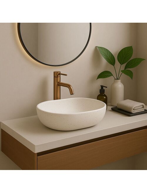 | Umywalka nablatowa Amelia Sandy o wyjątkowej strukturze inspirowanej naturalnym kamieniem to doskonałe połączenie elegancji i surowego piękna. Jej design idealnie pasuje do łazienek w stylu naturalnym, spa, japandi czy boho.