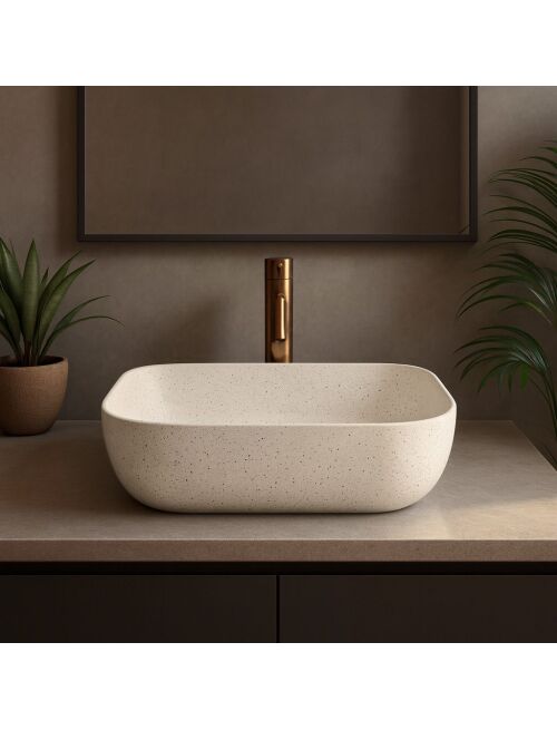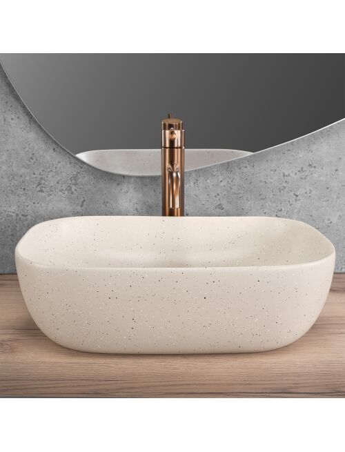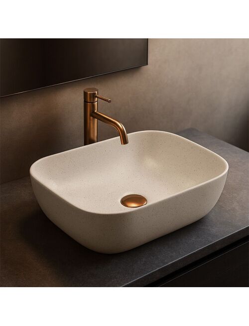 Umywalka nablatowa Belinda Sandy o wyjątkowej strukturze inspirowanej naturalnym kamieniem to doskonałe połączenie elegancji i surowego piękna. Jej design idealnie pasuje do łazienek w stylu naturalnym, spa, japandi czy boho. Wykonana z wysokiej jakości ceramiki sanitarnej, umywalka cechuje się trwałością i odpornością na codzienne użytkowanie. Model przystosowany jest do montażu zarówno na blacie, jak i na szafce, co pozwala dopasować go do indywidualnych potrzeb aranżacyjnych. Brak otworu na baterię umożliwia zastosowanie armatury stojącej lub podtynkowej, co daje pełną swobodę projektowania strefy umywalkowej. Ta umywalka to harmonijne połączenie natury, nowoczesnej formy i solidnego wykonania.