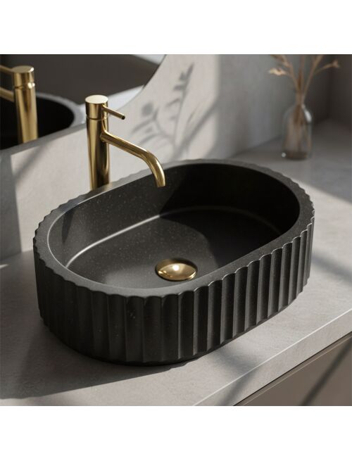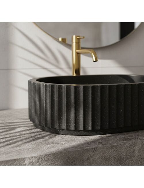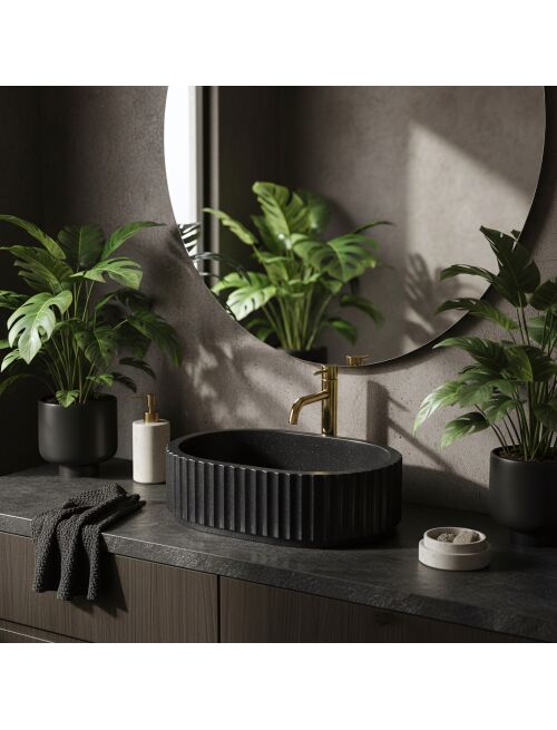 | Nadaj swojej łazience nowoczesnego wyrazu dzięki umywalce nablatowej Rea Margaret Black. Ten model wyróżnia się charakterystyczną, ryflowaną powierzchnią oraz solidnym wykonaniem. Stworzona z trwałego kompozytu Artificial Stone, łączy industrialną estetykę z elegancją architektonicznego detalu.Ryflowana struktura – zewnętrzne ścianki misy zdobią regularne, pionowe żłobienia. Ten dekoracyjny motyw nadaje bryle rytmu i stanowi ciekawy kontrapunkt dla gładkich powierzchni mebli łazienkowych.Wykończenie Black Stone – głęboka czerń materiału wzbogacona jest o subtelną, nakrapianą teksturę, co nadaje produktowi wyglądu naturalnego, ciemnego kamienia.Materiał Artificial Stone – zastosowany kompozyt kamienny gwarantuje wysoką odporność na uszkodzenia, zarysowania i przebarwienia. Jest też przyjemniejszy i cieplejszy w dotyku niż tradycyjna ceramika.Gładkie wnętrze – w przeciwieństwie do strukturalnej obudowy, środek misy jest idealnie gładki, co zapewnia swobodny spływ wody i ułatwia codzienne utrzymanie higieny.Montaż nablatowy – model przystosowany do instalacji na blacie lub szafce, co pozwala w pełni wyeksponować ozdobne ryflowanie bryły.Umywalka Rea Margaret Black to świetny wybór dla osób ceniących wyraziste wzornictwo. Jej ryflowana forma doskonale sprawdzi się w łazienkach w stylu loft, modern classic oraz glamour, stanowiąc mocny, a zarazem elegancki akcent aranżacji. |