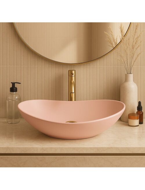 Umywalka nablatowa Royal w kolorze Powder Pink Matt to stylowe rozwiązanie, które łączy elegancję z praktycznością. Wykonana w 100% z wysokiej jakości ceramiki sanitarnej, zapewnia trwałość i niezawodność przez długie lata użytkowania. Matowa powierzchnia w subtelnym, pudrowo-różowym odcieniu jest odporna na zarysowania i zabrudzenia, a dodatkowo łatwa w czyszczeniu. Prosta forma oraz delikatny kolor sprawiają, że umywalka nablatowa doskonale podkreśla charakter łazienki i nadaje jej wyjątkowy styl. Model Royal Powder Pink Matt świetnie odnajdzie się w nowoczesnych aranżacjach, ale pasuje również do wnętrz klasycznych i retro, tworząc estetyczną oraz spójną przestrzeń.