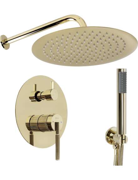 Zestaw prysznicowy podtynkowy Agron w złotym wykończeniu wyróżnia się nowoczesnym, minimalistycznym designem z subtelnymi ryflowaniami, co dodaje mu wyjątkowego charakteru. Dzięki specjalnej fazie produkcji zestaw gwarantujemy maksymalne bezpieczeństwo i komfort w codziennym użytkowaniu. Niepowtarzalne wzornictwo oraz wysoka jakość użytych materiałów dają gwarancję trwałości i niezawodność przez długie lata. Dzięki zaawansowanej technologicznie metody nakładania powłoki Pvd otrzymujemy powierzchnię 15-krotnie wytrzymalszą, od klasycznego galwanizowania. Gwarantuje to wysoką odporność na uszkodzenia mechaniczne, korozję, oraz wszelkiego rodzaju czynniki wpływające na powolną erozję powierzchni produktu.
