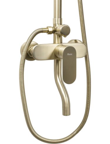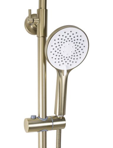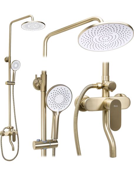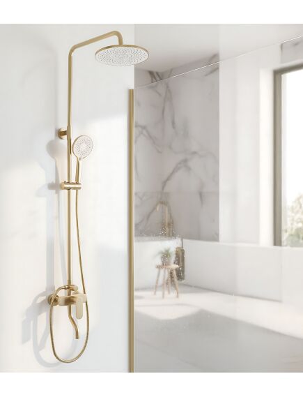 Zestaw prysznicowy w eleganckim kolorze złota szczotkowanego to nowoczesne i funkcjonalne rozwiązanie, które podkreśli wyjątkowy charakter Twojej łazienki. Minimalistyczny design w połączeniu z luksusowym wykończeniem sprawia, że zestaw świetnie komponuje się zarówno w aranżacjach glamour, jak i w nowoczesnych wnętrzach.