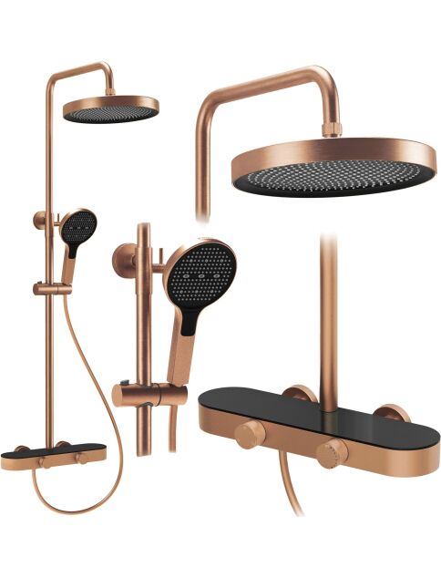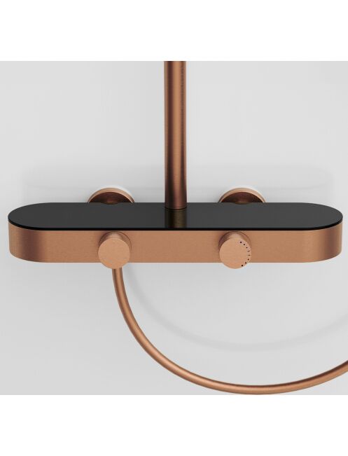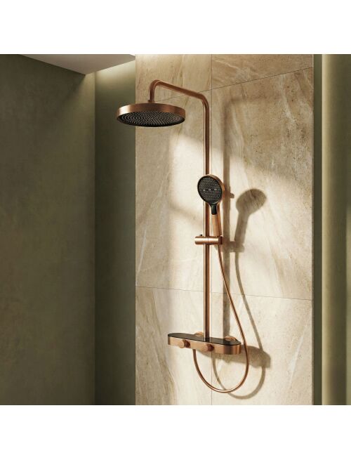 | Zestaw Prysznicowy REA Creo Miedź szczotkowana to nowoczesne rozwiązanie natynkowe, które łączy elegancką miedź szczotkowaną z wygodą codziennego użytkowania. Model został zaprojektowany z myślą o funkcjonalności i estetyce, dzięki czemu dobrze wpisuje się w aranżacje nowoczesne, loftowe oraz industrialne.Płynna regulacja pokrętłami – bateria została wyposażona w dwa ergonomiczne pokrętła. Pierwsze umożliwia precyzyjną i wygodną regulację temperatury wody, a drugie odpowiada za przełączanie trybów strumienia między deszczownicą, słuchawką i wylewką.Słuchawka z funkcją Bidetty – praktyczna słuchawka posiada przycisk z tyłu obudowy oraz dodatkowy wylot na górze. Po aktywacji może pełnić funkcję bidetki, co ułatwia szybkie opłukanie kabiny, umycie brodzika lub napełnienie wysokiego wiadra.Dyskretna wylewka kaskadowa – zintegrowana wylewka wannowa zapewnia szeroki, kaskadowy strumień, który sprawdza się podczas mycia rąk lub napełniania miski bez potrzeby używania słuchawki prysznicowej.Technologia PVD – wykończenie w kolorze miedzi szczotkowanej zostało uzyskane w technologii PVD. Powłoka jest jednolita, trwała i bardziej odporna na ścieranie, wilgoć oraz codzienne użytkowanie, dzięki czemu armatura dłużej zachowuje estetyczny wygląd.Solidna konstrukcja – korpus baterii wykonano z trwałego mosiądzu, co przekłada się na stabilność i długą żywotność. Deszczownica oraz słuchawka z ABS są lekkie, praktyczne i łatwe do utrzymania w czystości.Komfort dopasowania – drążek z regulacją wysokości pozwala dopasować ustawienie deszczownicy do wzrostu użytkowników oraz układu strefy prysznicowej.REA Creo Miedź szczotkowana to przemyślany zestaw prysznicowy dla osób, które oczekują nowoczesnego wyglądu i wygodnej obsługi. Funkcjonalne rozwiązania oraz trwałe materiały sprawiają, że codzienna kąpiel staje się bardziej komfortowa i intuicyjna. |