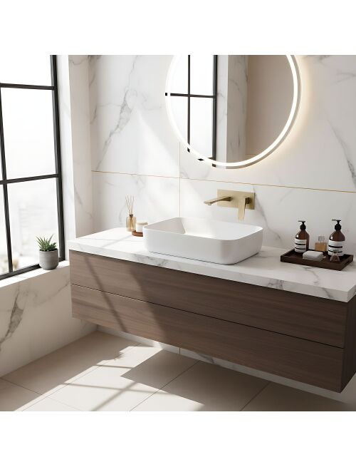 Podtynkowa bateria umywalkowa w kolorze złota szczotkowanego to propozycja dla osób ceniących nowoczesny styl i ponadczasową elegancję. Jej minimalistyczny design, oparty na prostych liniach i szlachetnym wykończeniu, sprawia, że doskonale wpasuje się zarówno w aranżacje glamour, jak i nowoczesne wnętrza.