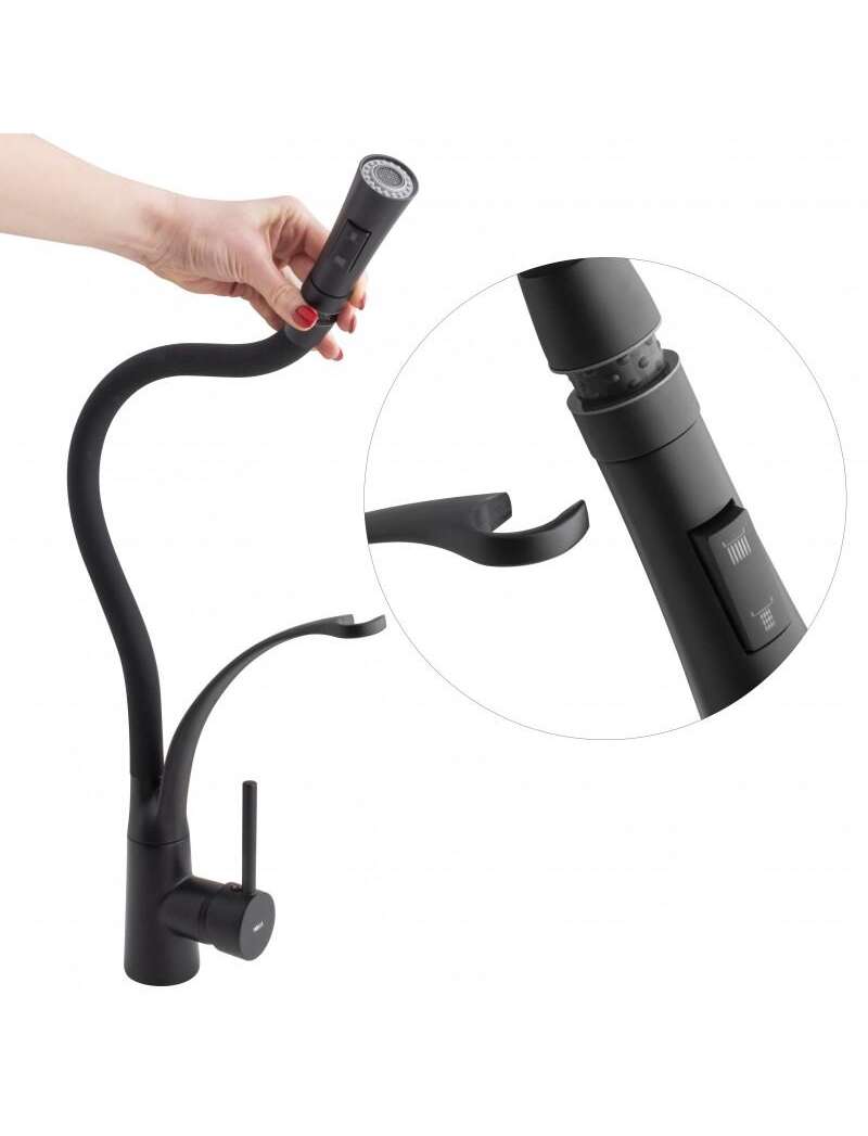 У него длинный, подвижный, гибкий носик черного цвета и двухструйный наконечник с режимом обычной струи и душа.