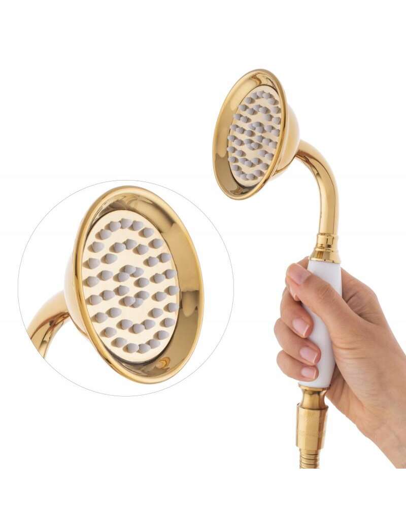 Смеситель для ванны с душевым гарнитуром в стиле ретро в золотом цвете с белыми вставками.Отличное качество поверхности гарантирует современная технология порошковой окраски. Дополнительным преимуществом является керамическая головка, обеспечивающая длительный срок службы. В телефоне используется система форсунок ANTI-CALC для предотвращения накипи.