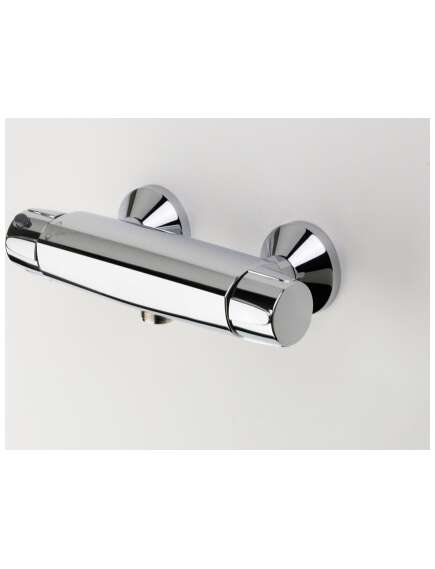 Dušas termostata jaucējkrāns uztur stabilu izvēlēto ūdens temperatūru, jo ātri un precīzi reaģē uz pienākošā ūdens temperatūras izmaiņām. Temperatūras regulēšanas rokturī ir temperatūras ierobežojoša poga, kuru nospiežot var iestatīt karstāku ūdeni (iestatīts uz 38o). Jaucējkrāns aprīkots ar filtriem, vienvirziena vārstiem, dekoratīvām rozetēm un ekscentra savienojumiem ar aizvaru. Karstā ūdens pievads labajā pusē.