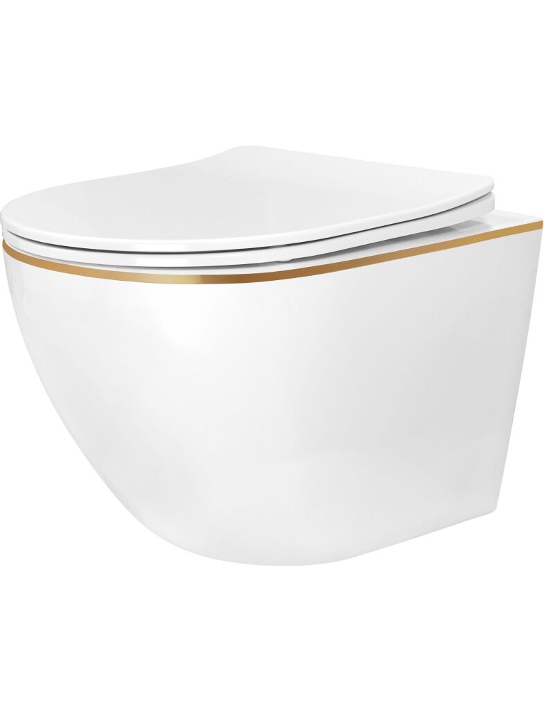 Podwieszana misa WC bezkołnierzowa w kolorze białym ze złotym rantem to nowoczesne rozwiązanie do eleganckich łazienek. Model wyposażono w innowacyjny system spłukiwania Tornado NF (New Flushing), który zapewnia skuteczne, ciche i oszczędne spłukiwanie przy minimalnym zużyciu wody.
