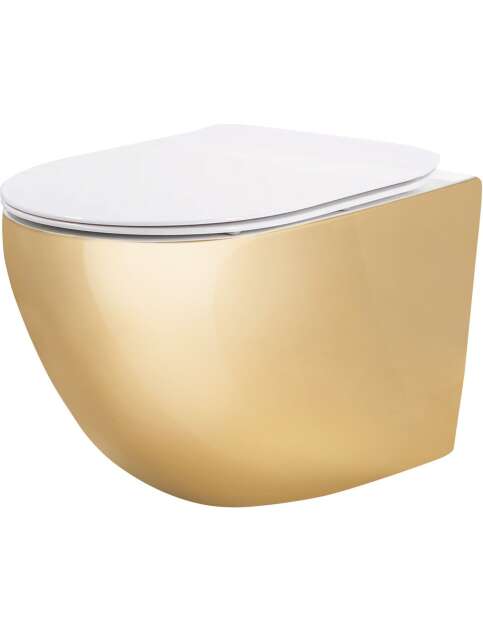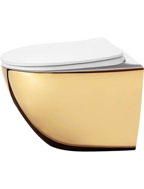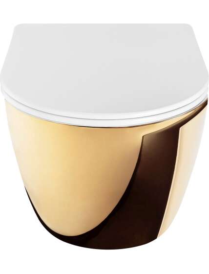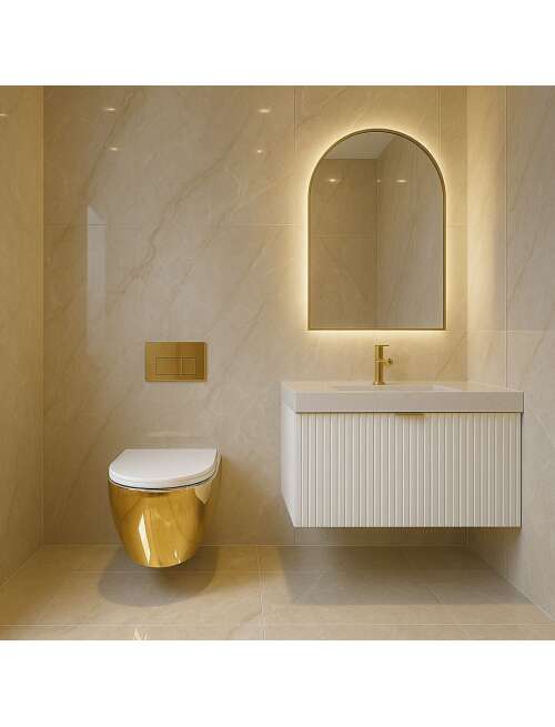 Podwieszana misa WC bezkołnierzowa w unikalnym złotym wykończeniu to propozycja dla osób, które pragną wprowadzić do swojej łazienki odważny design i luksusowy akcent.