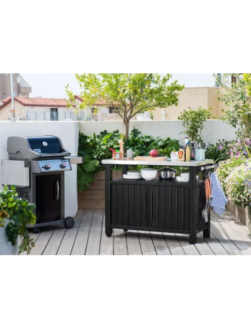UNITY XL 207L современный мобильный ящик для хранения специальных задач! Просторный двухдверный шкаф оснащенный функциональной столешницей из нержавеющей стали и удобной ручкой с крючками для полотенец отлично подойдет во время важных семейных встреч на террасе или в саду. В нем можно с комфортом разместить посуду еду напитки кухонную утварь и многие другие предметы необходимые для вечеринок и барбекю для большой группы гостей. Размеры: 134 x 52 x 90 см Размер упаковки: 1196 х 55 х 385 см. Емкость: 207 л Серый антрацит |