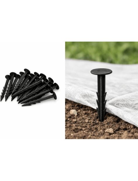 Крепёжные гвозди для агроплёнки это практичное и надёжное решение для фиксации агроплёнки противосорняковых покрытий геотекстиля и других укрывных материалов к почве. Длина гвоздей 125 см обеспечивает хорошую фиксацию в различных типах грунта. Изготовленные из прочного чёрного пластика они устойчивы к влаге погодным условиям и подходят для многократного использования. Идеальны как для частного так и для профессионального применения. Подходят для: