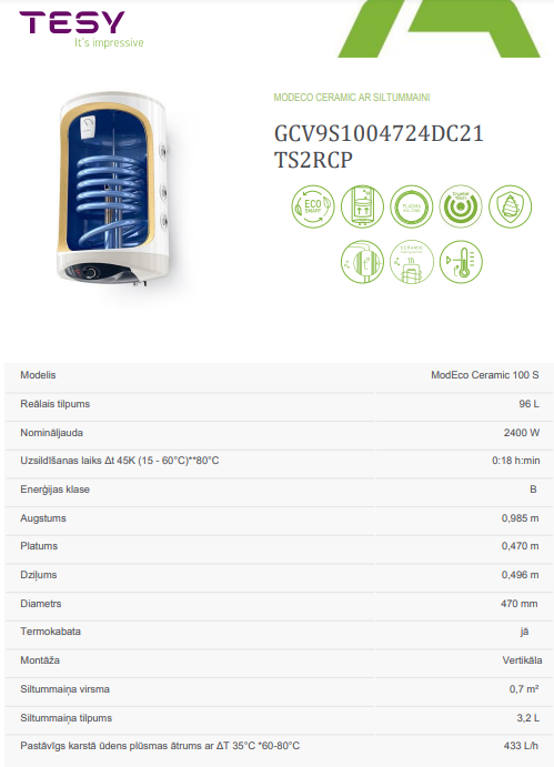 | ModЕco Ceramic sērijas elektriskie ūdens sildītāji ar iebūvētu siltummaiņu (serpentīnu) ir ļoti efektīvs risinājums alternatīvu siltumenerģijas avotu izmantošanai, piemēram, saules siltuma kolektori, gāzes sadedzināšanas un cietā kurināmā katli. | ||||||||||||