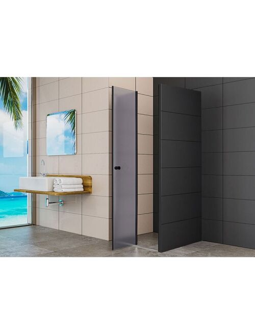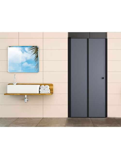 Suveriamos dušo durys į nišą, be padėklo Matmenys: 80 x 200 cm Juodos spalvos aliuminio profiliai. Durų pločio reguliavimo diapazonas: 80-82,5 cm Matinis, pilkai tonuotas grūdintas, 8 mm stiklas. Vidinės stiklo pusės paviršius - nematintas, padengtas NANO danga, kuri apsaugo nuo kalkių nuosėdų ir užtikrina ilgalaikį skaidrumą. NANO danga apdorotą stiklą lengviau nuvalyti, jis ilgiau išlaiko patrauklią išvaizdą. Sandarumą užtikrina magnetinės silikoninės tarpinės. Durys varstomos 180° kampu tiek į išorę, tiek į vidų. Dvidalės suveriamos dušo durys su viduriniu sulenkimo profiliu. Suveriamos durys taupo vonios kambario erdvę. Kai dušo erdvė nenaudojama, durys gali būti suveriamos į nišos vidų. Integruota pasukamų guolių pakėlimo/nuleidimo technologija šiek tiek pakelia durų elementus, kai durys atidaromos, ir švelniai nuleidžia juos atgal, kai durys uždaromos. Tai užtikrina sandarų durų uždarymą ir apsaugo apatines sandarinimo juostas nuo trinties. Durys gali būti montuojamos ant padėklo arba tiesiai ant grindų. |