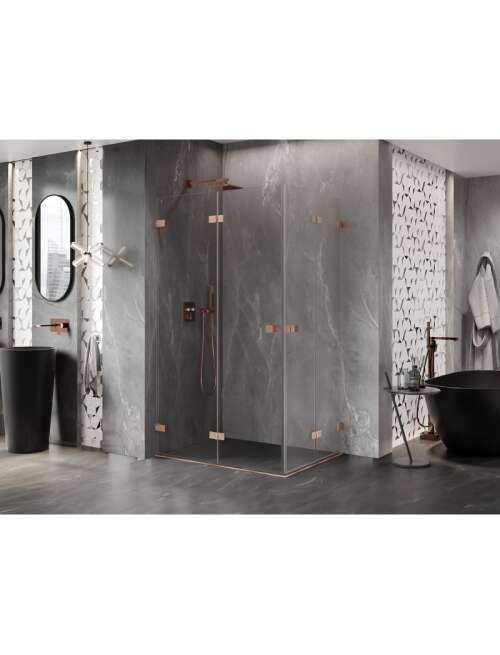 Specyfikacja produktu:Rozmiar: 85x80 cm Wysokość: 200 cm Strona montażu: Uniwersalna Wejście: Drzwi składane Kolor szkła: Transparentne Wykończenie: Miedź szczotkowana Profil: Aluminiowy Rodzaj szkła: Hartowane Grubość szkła: 6 mm Powłoka ułatwiająca czyszczenie Możliwa regulacja szerokości Dwa systemy mocowania: - Z profilem, który umożliwia niwelacje nierówności ściany - Bez profilu w przypadku idealnie prostych ścian Możliwość montażu na brodziku lub płytkach Mosiężne klamry i zawiasy zlicowane z taflą szkła Listwa magnetyczna oraz uszczelki elastomerowe odprowadzające wodę Aluminiowy próg uszczelniający drzwi |