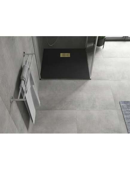 Dane techniczne: Rozmiar: 80x80x2,6 cm Kolor: Czarny Typ: Kwadratowy, Ultrapłaski Montaż: W posadzce lub na posadzce Materiał: SMC - tworzywo sztuczne Struktura kamienia Możliwość przycięcia brodzika Trwały produkt, który nie ulegnie deformacji Maksymalna stabilność dzięki dobrej odporności na uderzenia W komplecie syfon czyszczony od góry Średnica odpływu: 90 mm Wykończenie maskownicy: Złote |
