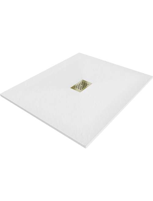 Dane techniczne: Rozmiar: 140x100x2,6 cm Kolor: Biały Typ: Prostokątny, Ultrapłaski Montaż: W posadzce lub na posadzce Materiał: SMC - tworzywo sztuczne Struktura kamienia Możliwość przycięcia brodzika Trwały produkt, który nie ulegnie deformacji Maksymalna stabilność dzięki dobrej odporności na uderzenia W komplecie syfon czyszczony od góry Średnica odpływu: 90 mm Wykończenie maskownicy: Złote |
