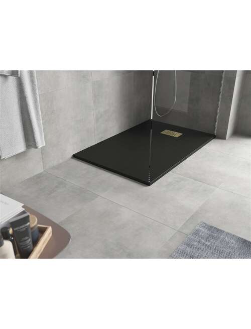 Dane techniczne: Rozmiar: 90x70x2,6 cm Kolor: Czarny Typ: Prostokątny, Ultrapłaski Montaż: W posadzce lub na posadzce Materiał: SMC - tworzywo sztuczne Struktura kamienia Możliwość przycięcia brodzika Trwały produkt, który nie ulegnie deformacji Maksymalna stabilność dzięki dobrej odporności na uderzenia W komplecie syfon czyszczony od góry Średnica odpływu: 90 mm Wykończenie maskownicy: Złote |
