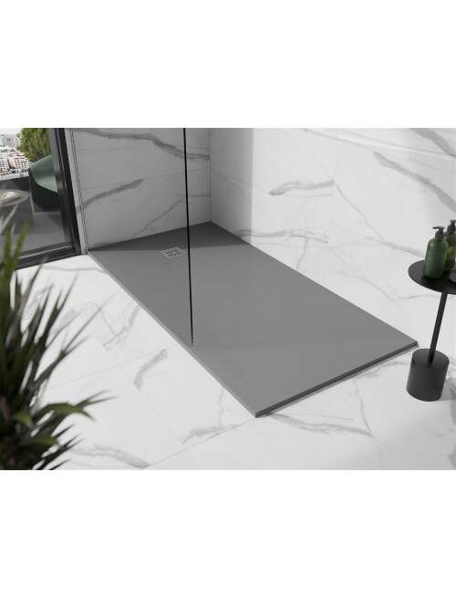 Dane techniczne: Rozmiar: 180x80x2,5 cm Kolor: Szary - Beton Typ:Prostokątny, Ultrapłaski Montaż: W posadzce lub na posadzce Materiał: Kompozyt mineralny Struktura kamienia Trwały produkt, który nie ulegnie deformacji Maksymalna stabilność dzięki dobrej odporności na uderzenia W komplecie syfon czyszczony od góry Średnica odpływu: 90 mm Wykończenie maskownicy: Inox |
