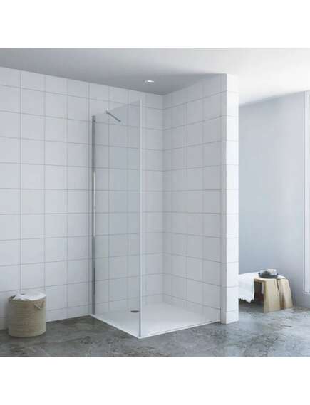 Stacionari dušo sienelė be padėklo Matmenys: 70 x 185 cm Chromuotas, nerūdijančio plieno atraminis sieninis stabilizavimo laikiklis. Ilgis: 45 cm Chromo spalvos aliuminio profilis. Sienelės pločio reguliavimo diapazonas 67,5-69,5 cm 5 mm skaidrus grūdintas stiklas. Universalus montavimas: kairinis/ dešininis. Gamintojas: AQUABATOS, Vokietija |