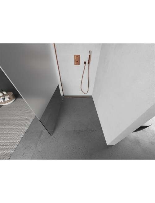 Specyfikacja produktu:Szerokość: 130 cm Wysokość: 200 cm Montaż: Uniwersalny, prawa lub lewa Kolor szkła: Transparent/Szron Wykończenie: Różowe złoto Rodzaj szkła: Hartowane Grubość szkła: 8 mm Profil: Aluminiowy Wspornik: Stal nierdzewna Długość max. wspornika: 150 cm Możliwość przycięcia wspornika Powłoka ułatwiająca czyszczenie Niwelacja nierówności ściany Możliwość montażu na brodziku lub płytkach |