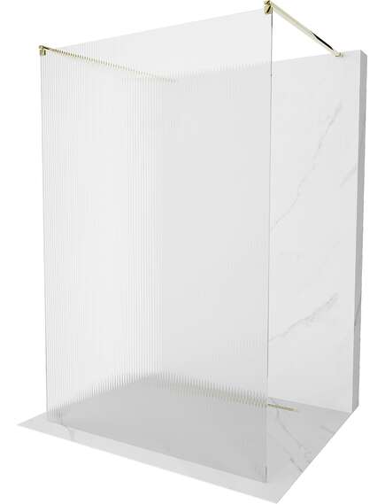 Dane techniczne: Szerokość: 110 cm Wysokość: 200 cm Montaż: Uniwersalny, prawa lub lewa Kolor szkła: Prążki Wykończenie: Złoty Rodzaj szkła: Hartowane Grubość szkła: 8 mm Profil: Aluminiowy Wspornik: Stal nierdzewna Długość max. wspornika: 150 cm Możliwość przycięcia wspornika Powłoka ułatwiająca czyszczenie Niwelacja nierówności ściany Możliwość montażu na brodziku lub płytkach |