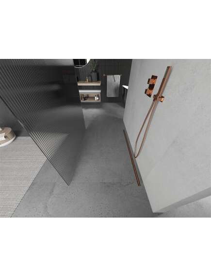 Dane techniczne: Szerokość: 130 cm Wysokość: 200 cm Montaż: Uniwersalny, prawa lub lewa Kolor szkła: Prążki Wykończenie: Różowe złoto Rodzaj szkła: Hartowane Grubość szkła: 8 mm Profil: Aluminiowy Wspornik: Stal nierdzewna Długość max. wspornika: 150 cm Możliwość przycięcia wspornika Powłoka ułatwiająca czyszczenie Niwelacja nierówności ściany Możliwość montażu na brodziku lub płytkach |