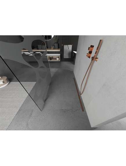 Specyfikacja produktu:Szerokość: 140 cm Wysokość: 200 cm Montaż: Uniwersalny, prawa lub lewa Kolor szkła: Transparent/Biały wzór Wykończenie: Różowe złoto Rodzaj szkła: Hartowane Grubość szkła: 8 mm Profil: Aluminiowy Wspornik: Stal nierdzewna Długość max. wspornika: 150 cm Możliwość przycięcia wspornika Powłoka ułatwiająca czyszczenie Niwelacja nierówności ściany Możliwość montażu na brodziku lub płytkach |