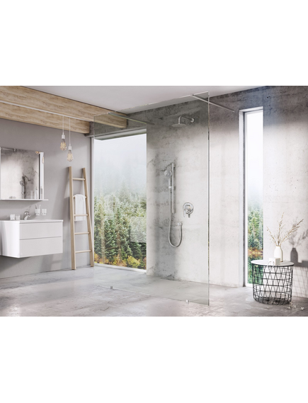 . Izstrādājuma stabilitāti nodrošina divi metāla ekrāna balsta stieņi, kas nosaka atvērtas ieejas platumu no divām pusēm. Walk-In Free dušas kabīne ar glancētu hromētu metāla detaļu apdari. Mēs iesakām to uzstādīt uz Ravak dušas paliktņiem no Slate Pro un Sandstone Pro sērijas vai tieši uz grīdas ar iebūvētu dušas kanālu vai punktveida notekcaurules. Iepakojumā ir fiksēts stikla panelis. Komplektācijā ietilpst arī stikla skavas un metāla sieta atbalsta stieņi ar spīdīgu hromētu apdari. Šīs detaļas nosaka ieejas platumu. Universālo 120 cm garo atbalsta stieni var saīsināt pēc vajadzības atbilstoši nepieciešamajam ieejas platumam. Ekrāna atbalsta stieņi ir pabeigti ar metāla gala vāciņu pie sienas, lai nosegtu nogriezto galu.