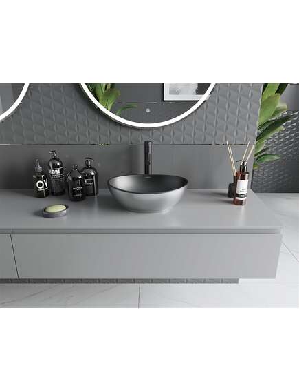 Dane techniczne Rozmiar: 40,5x33x14 cm Głębokość: 12,5 cm Typ: Nablatowa Kolor: Czarny mat/Srebrny Materiał: Ceramika sanitarna Otwór przelewowy: Nie Otwór na baterie: Nie |
