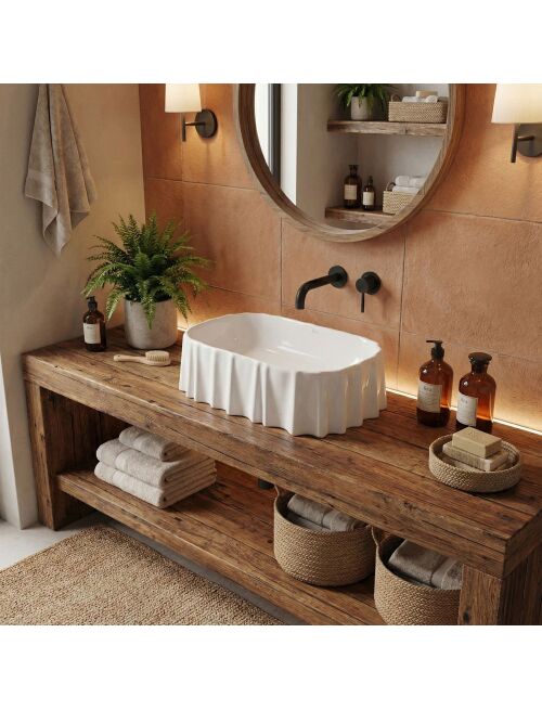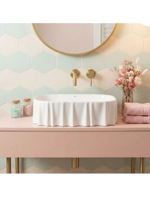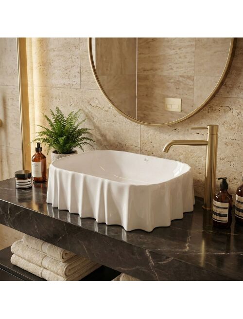 Montaż nablatowy – pozwala na efektowne wyeksponowanie nietypowego kształtu misy, jednocześnie oszczędzając cenne miejsce w szafce pod blatem.