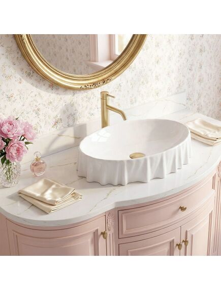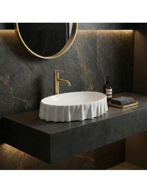 Montaż nablatowy – pozwala na efektowne wyeksponowanie nietypowego kształtu misy, jednocześnie oszczędzając cenne miejsce w szafce pod blatem.