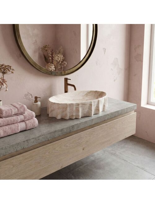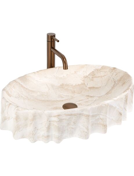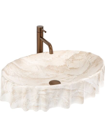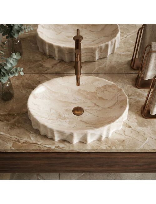 | Umywalka nablatowa Aurelia Reno to propozycja dla osób, które szukają w łazience czegoś więcej niż standardowej formy. Jej nieregularna, organiczna linia przypomina rzeźbiony blok kamienia, dzięki czemu misa staje się wyrazistym elementem aranżacji i natychmiast przyciąga wzrok. Falowany rant i masywna bryła budują efekt luksusowego, designerskiego akcentu, który doskonale wpisuje się w nowoczesne wnętrza premium oraz projekty inspirowane naturą i architekturą spa.Powierzchnia umywalki została wykończona subtelnym, kamiennym wzorem z delikatnym, marmurkowym użyleniem w jasnych, ciepłych tonacjach. Taka kolorystyka nadaje wnętrzu lekkości i elegancji, a jednocześnie świetnie komponuje się zarówno z jasnymi blatami, naturalnym drewnem, jak i z ciemniejszymi, kontrastowymi aranżacjami. Owalna, głęboka misa zapewnia komfort podczas codziennego użytkowania, a gładkie wykończenie podkreśla ekskluzywny charakter modelu Aurelia Reno, czyniąc go nie tylko efektownym wizualnie, ale i praktycznym elementem nowoczesnej łazienki. |