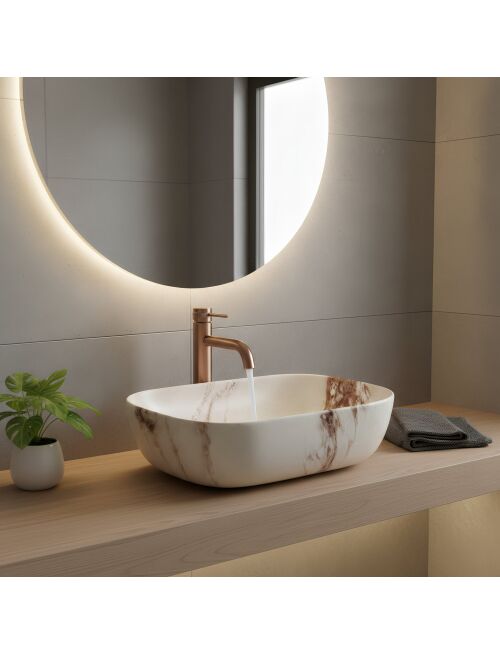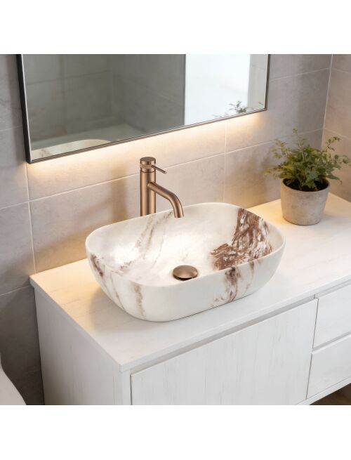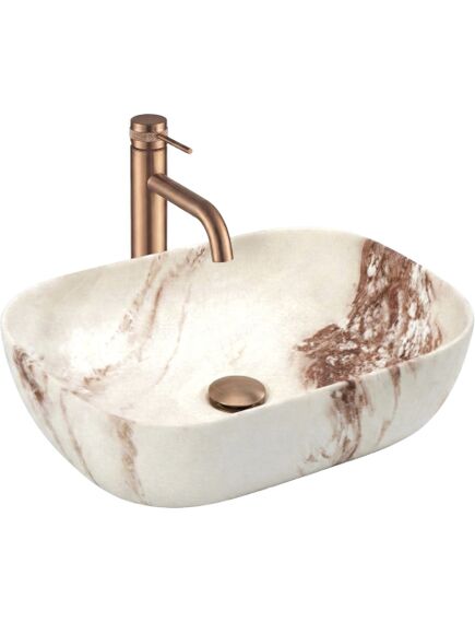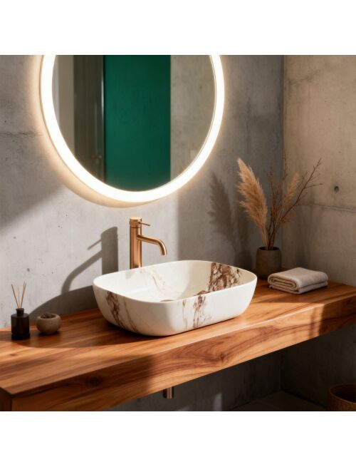 | Umywalka nablatowa Belinda Marrone Matt o wyjątkowej strukturze inspirowanej naturalnym kamieniem to doskonałe połączenie elegancji i surowego piękna. Jej design idealnie pasuje do łazienek w stylu naturalnym, spa, japandi czy boho.
