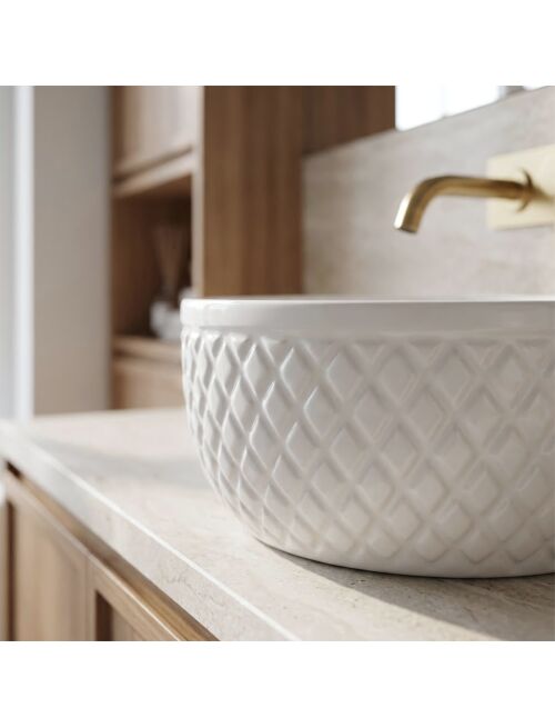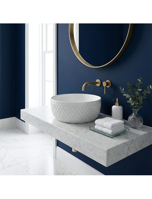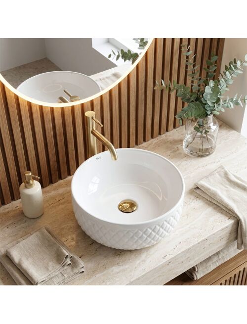 | Podkreśl elegancki charakter swojej łazienki dzięki umywalce nablatowej Rea Galaxy. Ten model to połączenie klasycznej bieli z dekoracyjną formą, która przykuwa wzrok. Zewnętrzne ścianki misy zdobi ryflowana struktura w romby, nadająca ceramice wygląd luksusowego akcesorium w stylu glamour.Dekoracyjna faktura – zewnętrzna powierzchnia umywalki posiada wyraźne, geometryczne tłoczenia przypominające pikowanie, co tworzy efektowną grę światłocienia i ożywia aranżację.Optymalna wysokość – misa jest głębsza niż standardowe modele. Taki wymiar ogranicza rozchlapywanie wody i czyni ją idealną do zestawienia z wysokimi bateriami stojącymi lub podtynkowymi.Biała ceramika – wykonanie z wysokiej jakości, szkliwionej ceramiki sanitarnej zapewnia trwałość, nienaganny połysk oraz odporność na zarysowania.Gładkie wnętrze – w przeciwieństwie do ozdobnej obudowy, środek misy jest idealnie gładki, co ułatwia codzienne czyszczenie i zapewnia higienę.Montaż nablatowy – umywalka przystosowana jest do postawienia na blacie lub szafce, stając się wyrazistym, centralnym elementem strefy mycia.Umywalka Rea Galaxy to propozycja dla osób, które chcą przełamać minimalizm w łazience. Jej biżuteryjny design doskonale komponuje się z eleganckimi dodatkami, łącząc walory użytkowe głębokiej misy z unikalnym stylem. |
