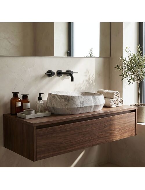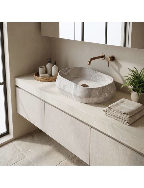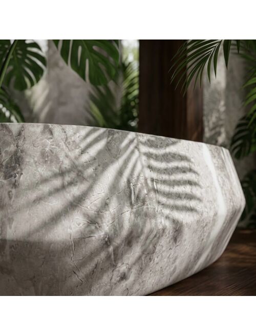 | Wybierz umywalkę nablatową Rea Zoe Rock, jeśli szukasz nowoczesnych i nietypowych rozwiązań do swojej łazienki. Model ten wyróżnia się asymetryczną konstrukcją oraz fakturą inspirowaną kamieniem. Wykonana z trwałego kompozytu Artificial Stone, łączy ciekawy wygląd z wysoką odpornością użytkową.Asymetryczna bryła – charakterystyczną cechą umywalki jest jej nieregularna wysokość. Jeden bok misy jest wyraźnie wyższy od drugiego, co tworzy nowoczesny, ścięty kształt.Materiał Artificial Stone – zastosowany sztuczny kamień kompozytowy jest solidny i odporny na uszkodzenia mechaniczne, a przy tym cieplejszy w dotyku niż standardowa ceramika.Design “Rock” – jasna powierzchnia z szarym użyleniem oraz geometryczne załamania na zewnętrznych ściankach nadają bryle surowego charakteru.Gładkie wnętrze – w przeciwieństwie do strukturalnej obudowy, środek misy jest idealnie gładki, co zapewnia swobodny spływ wody i ułatwia codzienne czyszczenie.Montaż nablatowy – umywalka przeznaczona jest do instalacji na blacie lub szafce, dzięki czemu jej nietypowa forma jest w pełni widoczna.Umywalka Rea Zoe Rock to propozycja do wnętrz o nowoczesnym lub industrialnym charakterze. Jej geometryczna, asymetryczna forma stanowi mocny punkt aranżacji, zastępując tradycyjne, owalne misy. |