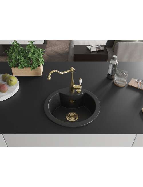 Dane techniczne: Zlewozmywak: Rozmiar: 488x488x167 mm Głębokość komory: 157 mm Szerokość komory: 406 mm Średnica odpływu: ø90 mm Typ: 1-komorowy Rodzaj: Wpuszczany w blat Kolor: Czarny/Srebrny metalik Wykończenie syfonu: Złoty Materiał: Granit (80% kruszywo granitowe 20% żywice) Otwór przelewowy: Tak Otwory: ( bateria, automat ) 2 Wysoka odporność na zarysowania i przebarwienia Odporność na szok termiczny Powierzchnia ułatwiająca czyszczenie Jeden dodatkowy podfrezowany otwór do samodzielnego wybicia ø35 Bateria kuchenna: Materiał: Mosiądz Kolor: Złoty Głowica: Ceramiczna Perlator: Tak Typ: Jednouchwytowa Wysokość baterii: 290 mm Zasięg wylewki: 260 mm |