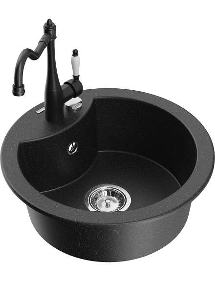 Mexen Diego zlewozmywak granitowy 1-komorowy z baterią kuchenną Carla, czarny/srebrny metalik - 6512-73-670700-70