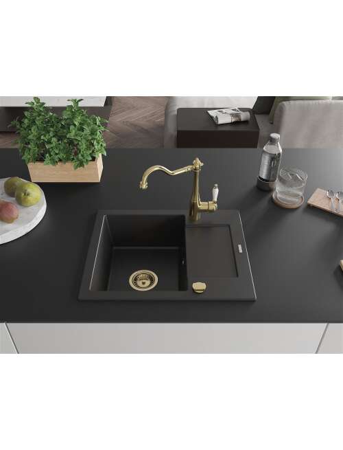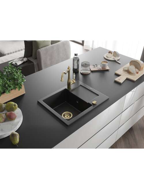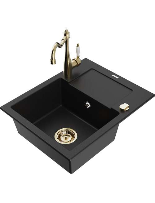 Mexen Enzo zlewozmywak granitowy 1-komorowy z ociekaczem i baterią kuchenną Carla, czarny - 6506-77-670700-50