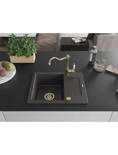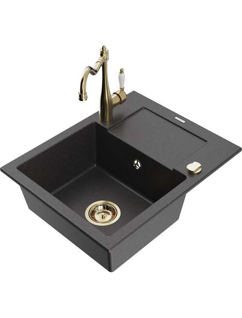 Mexen Enzo zlewozmywak granitowy 1-komorowy z ociekaczem i baterią kuchenną Carla, czarny nakrapiany - 6506-76-670700-50