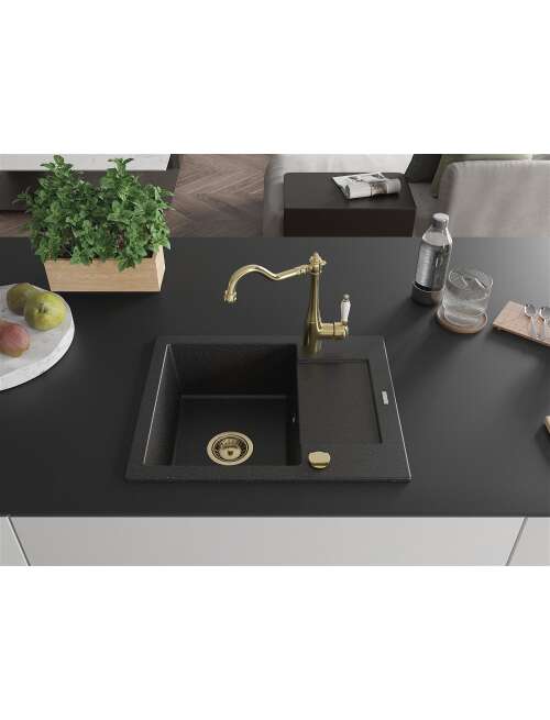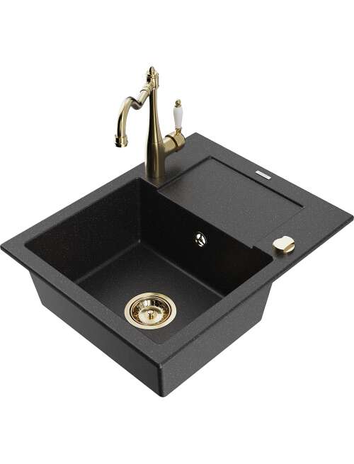 Mexen Enzo zlewozmywak granitowy 1-komorowy z ociekaczem i baterią kuchenną Carla, czarny/srebrny metalik - 6506-73-670700-50