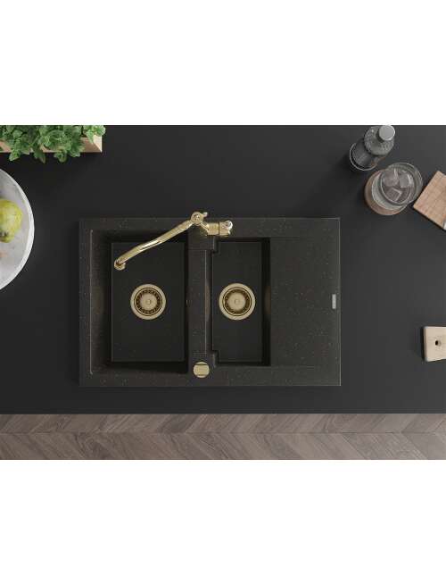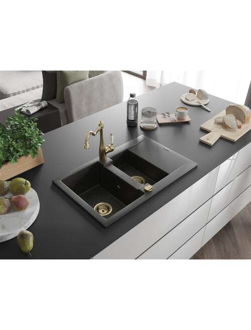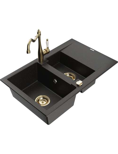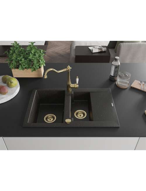 Dane techniczne: Zlewozmywak: Rozmiar: 737x475x177 mm Głębokość komory: 167 mm (większa), 107 mm (mniejsza) Wymiary komory: 395x272 mm (większa), (mniejsza) 375x182 mm Średnica odpływu: ø90 mm Typ: 1,5-komorowy z krótkim ociekaczem Rodzaj: Wpuszczany w blat Kolor: Czarny/Złoty metalik Wykończenie syfonu: Złoty Materiał: Granit (80% kruszywo granitowe 20% żywice) Otwór przelewowy: Tak Otwory: ( bateria, automat ) 2 Montaż: Uniwersalny, możliwość montażu z ociekaczem po lewej lub prawej stronie Wysoka odporność na zarysowania i przebarwienia Odporność na szok termiczny Powierzchnia ułatwiająca czyszczenie Bateria kuchenna: Materiał: Mosiądz Kolor: Złoty Głowica: Ceramiczna Perlator: Tak Typ: Jednouchwytowa Wysokość baterii: 290 mm Zasięg wylewki: 260 mm |