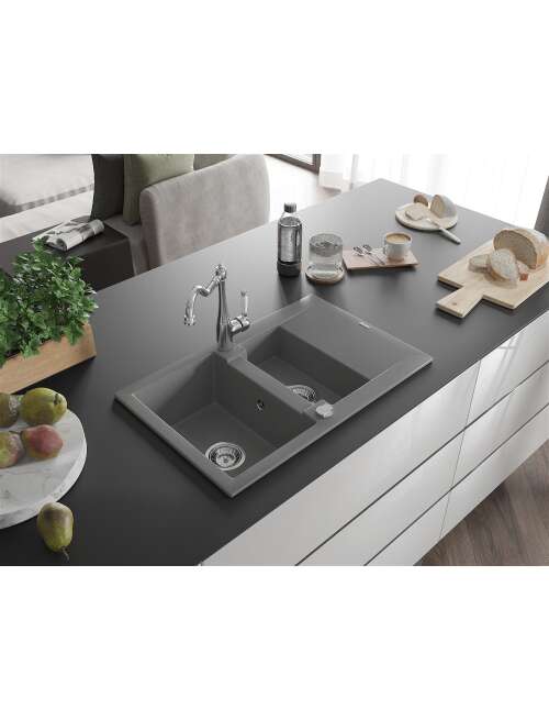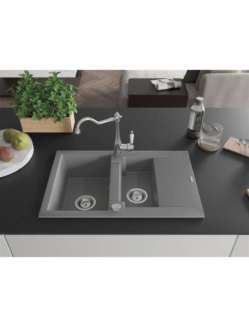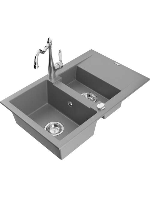 Dane techniczne: Zlewozmywak: Rozmiar: 737x475x177 mm Głębokość komory: 167 mm (większa), 107 mm (mniejsza) Wymiary komory: 395x272 mm (większa), (mniejsza) 375x182 mm Średnica odpływu: ø90 mm Typ: 1,5-komorowy z krótkim ociekaczem Rodzaj: Wpuszczany w blat Kolor: Szary Wykończenie syfonu: Chrom Materiał: Granit (80% kruszywo granitowe 20% żywice) Otwór przelewowy: Tak Otwory: ( bateria, automat ) 2 Montaż: Uniwersalny, możliwość montażu z ociekaczem po lewej lub prawej stronie Wysoka odporność na zarysowania i przebarwienia Odporność na szok termiczny Powierzchnia ułatwiająca czyszczenie Bateria kuchenna: Materiał: Mosiądz Kolor: Chrom Głowica: Ceramiczna Perlator: Tak Typ: Jednouchwytowa Wysokość baterii: 290 mm Zasięg wylewki: 260 mm |