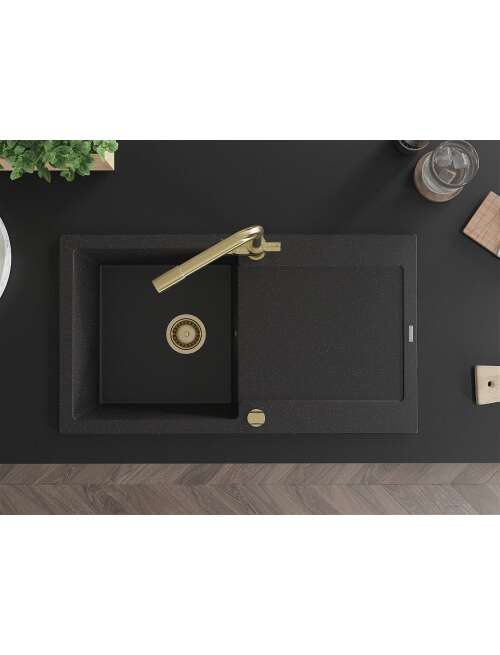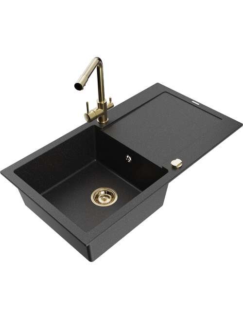 Mexen Leo zlewozmywak granitowy 1-komorowy z ociekaczem i baterią kuchenną Duero, czarny/srebrny metalik - 6501-73-671600-50