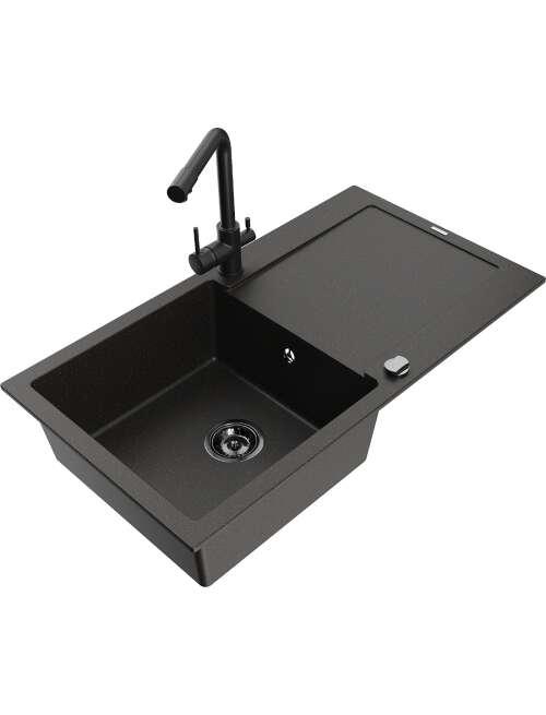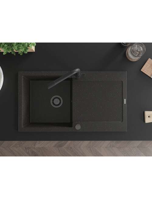 Mexen Leo zlewozmywak granitowy 1-komorowy z ociekaczem i baterią kuchenną Duero, czarny/złoty metalik - 6501-75-671600-70-B